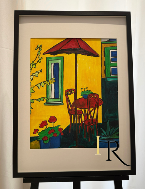 📝 Descripción del producto: Obra vibrante y acogedora que retrata una escena de terraza al aire libre, con una mesa roja y dos sillas bajo una sombrilla del mismo tono, enmarcadas por una fachada amarilla con detalles verdes. Las plantas en flor y los jarrones azules sobre la mesa aportan frescura y encanto, mientras que el estilo naïf y los colores intensos transmiten alegría y calidez. Ideal para espacios que buscan energía positiva y un toque mediterráneo con carácter decorativo.