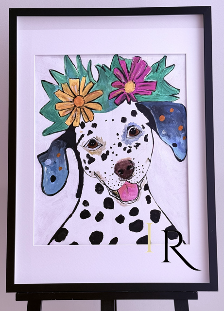 📝 Descripción del producto: Esta obra en acrílico muestra a un perro dálmata de expresión alegre y mirada vivaz, coronado por un tocado de grandes flores en tonos amarillo, naranja y fucsia con hojas verdes que aportan contraste. El artista emplea pinceladas sueltas y colores intensos —incluyendo orejas azuladas con motas naranjas— que rompen con el blanco y negro característico del pelaje. La composición transmite ternura y optimismo; ideal para aportar color y personalidad a interiores contemporáneos.