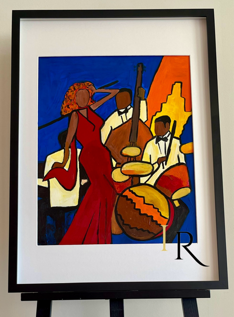 La obra fusiona elementos del arte afroamericano y el modernismo expresionista, capturando no solo el sonido sino la pasión y la conexión entre los músicos. Perfecta para espacios modernos, salones musicales o coleccionistas que buscan arte que evoque cultura, intensidad y vida nocturna.